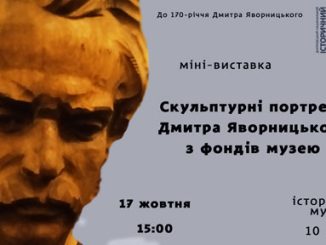 17 жовтня о 15:00 в Дніпропетровському національному історичному музеї імені Д. І. Яворницького відбудуться відкриття міні-виставки «Скульптурні портрети Дмитра Яворницького з фондів музею» в рамках виставки «Дмитро Яворницький. Життя. Колекції. Спадщина».